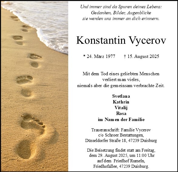 Liebe Familie Vycerov. Ich wünsche euch mein herzlichsten Beileid zu eurem unerwarteten und viel zu frühen Verlust eures Vaters und Ehemanns. Ich bin sehr betroffen und in Gedanken bei euch. Tasso, ehemaliger Vorarbeiter bei BEDA und Freund.